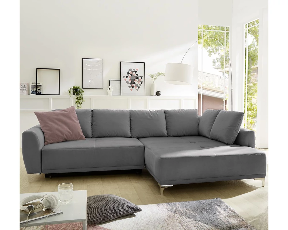 Modern sarokülő vendégágy funkcióval. A hullámrugós, kiváló minőségű habpárnázás kiváló ülési és fekvési kényelmet biztosít. Az integrált ágyneműtartós doboz bőséges tárolóhelyet kínál. A háttámla valódi szövettel van bevonva. Hat hátpárnát és egy puha párnát tartalmaz.