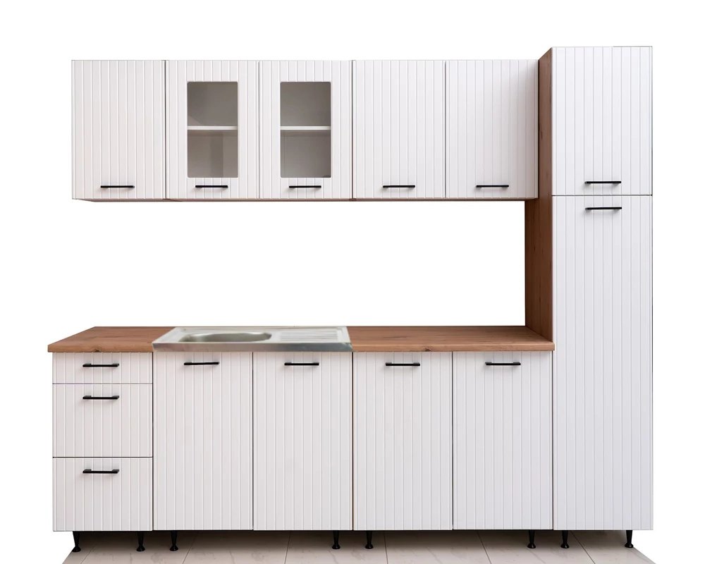 Modern színű konyhabútor. Teletetős mosogatótálcát az ár tartalmazza. Lábon álló kivitel a könnyebb tisztán tarthatóság érdekében, a lábak állíthatók, így kiküszöbölhető a padlózat esetleges kisebb egyenetlensége.